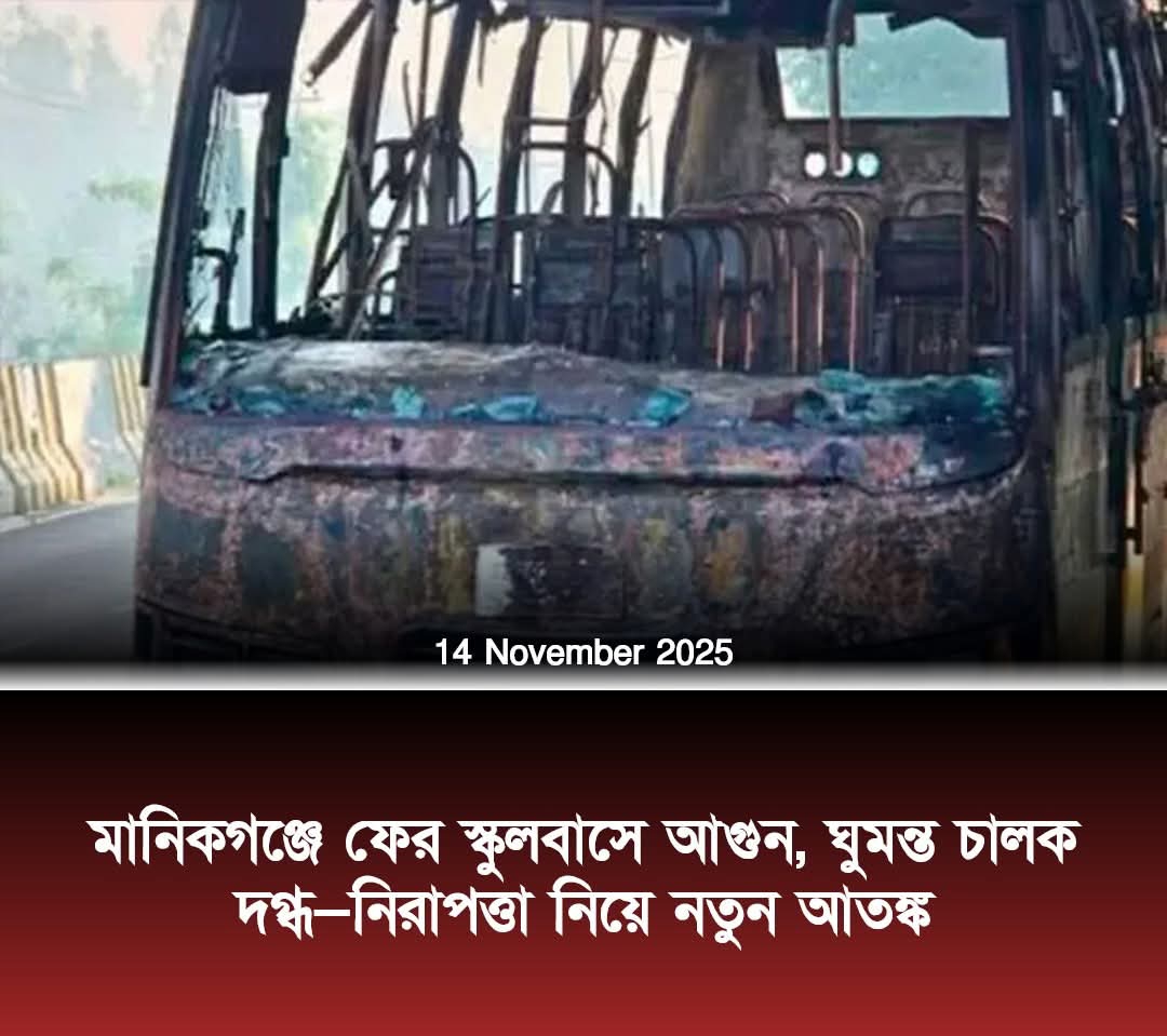 অপরাধঢাকা মানিকগঞ্জে ফের স্কুলবাসে আগুন, ঘুমন্ত চালক দগ্ধ—নিরাপত্তা নিয়ে নতুন আতঙ্ক